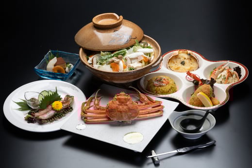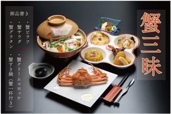 当館隣接のレストラン「松栄館」にて、蟹三昧コースが始まりました!日本海直送の蟹料理を、お手頃価格でお召し上がり頂けます。